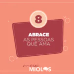 ABRACE AS PESSOAS QUE AMA: Nós, seres humanos, temos necessidade de nos conectarmos emocionalmente a alguém. Abraçar quem se ama é trocar afeto e amor, uma maneira de nos sentirmos mais felizes e estimulados a conquistar os nossos objetivos.
