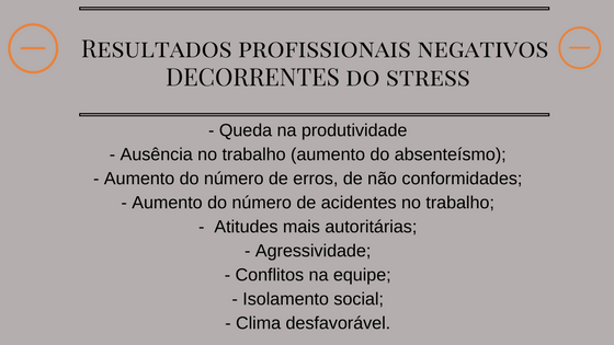 Como consequências dessas disfunções geradas pelo stress poderão ocorrer limitações no gerenciamento de processos, na eficiência e eficácia, ocasionando queda da produtividade do profissional e da organização, além de muitas outras consequências para a saúde do indivíduo e da empresa.