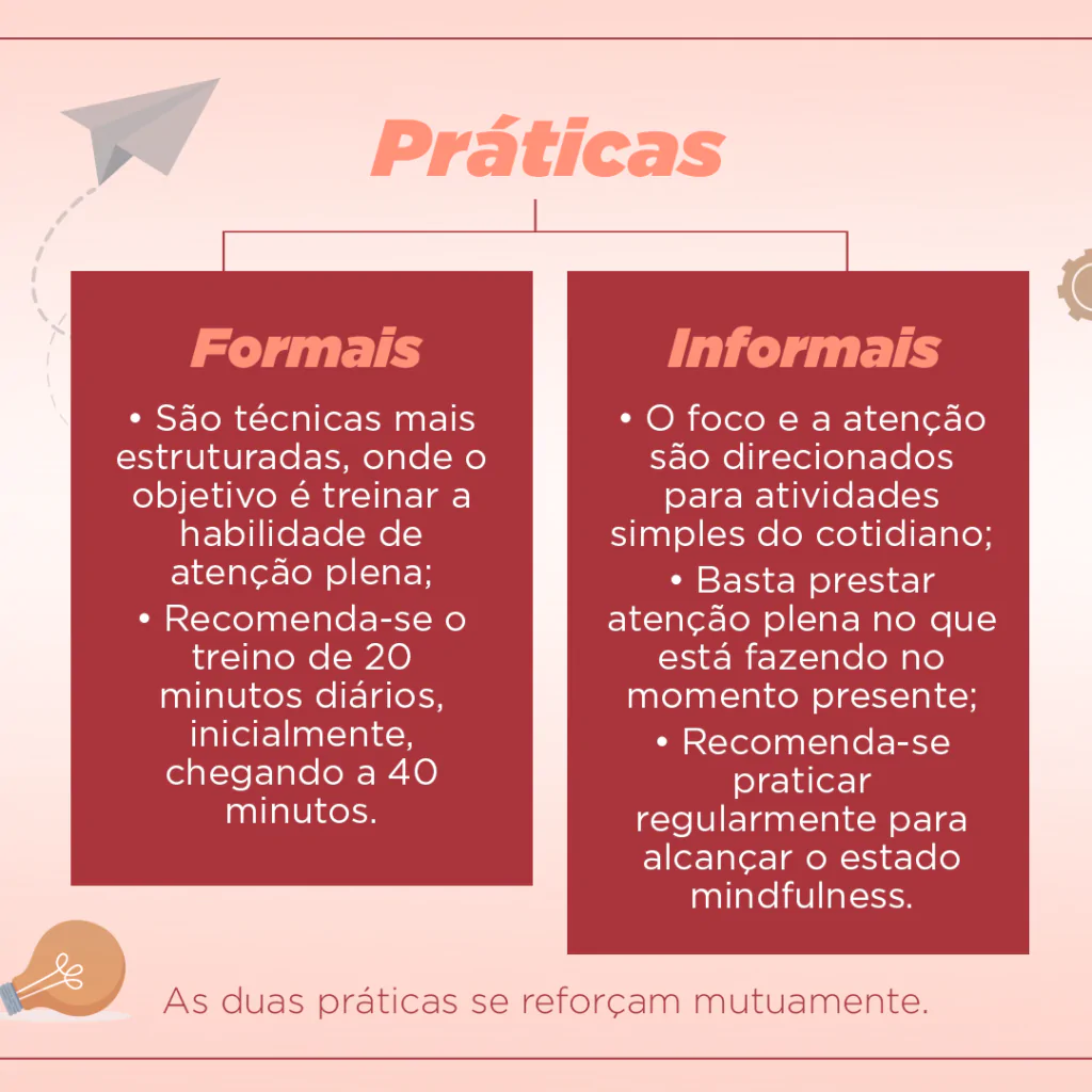 A técnica conhecida como Mindfulness pode ser dividida entre: práticas formais e informais, e ambas se reforçam mutuamente. As práticas formais são técnicas mais estruturadas, cujo objetivo é treinar a habilidade de atenção plena; a mais utilizada e conhecida é aquela que utiliza o foco na própria respiração. Outros exemplos são a caminhada meditativa e o escaneamento corporal. Recomenda-se o treino por 20 minutos diários, podendo chegar a 40 minutos.