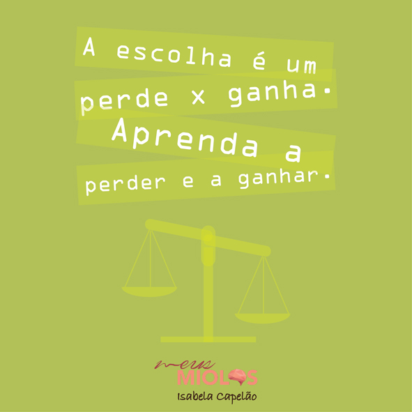Isso acontece porque queremos nos beneficiar de todos os lados, queremos atender às nossas solicitações internas, nossos desejos e necessidades e ficamos presos, com medo de errar, de perder e pensando “e se…”. Quando fazemos escolhas elas são nada mais e nada menos que trocas, onde você vai ganhar e vai perder. Por isso tem que aprender a lidar com as perdas, por mais dolorosas que pareçam ….e a lidar com o risco de não ganhar e permanecer no mesmo lugar.