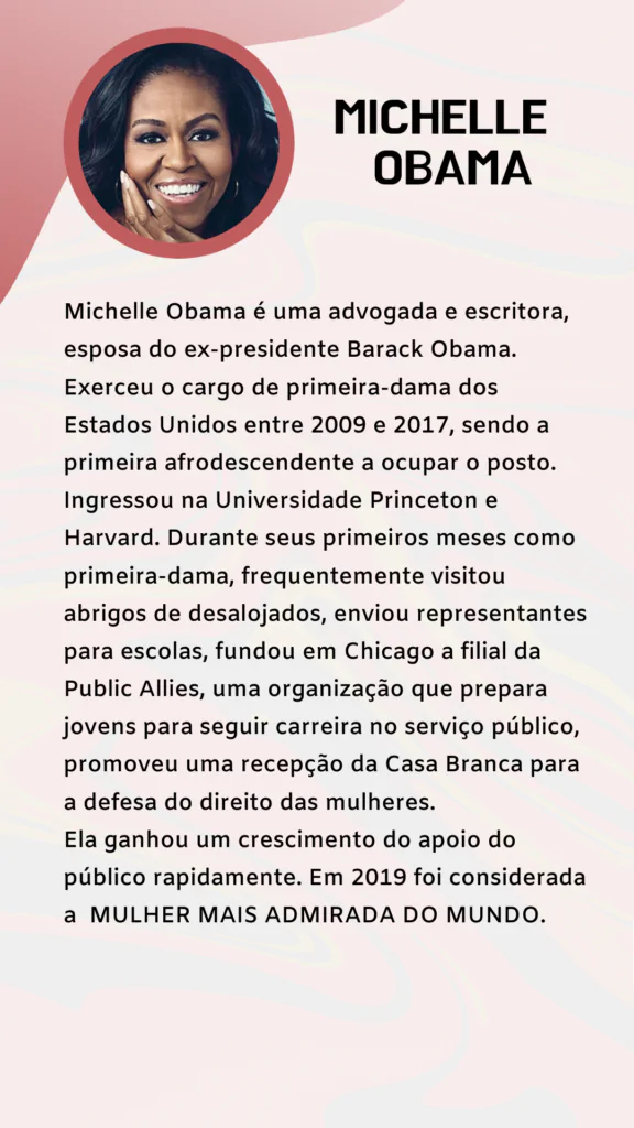 Michelle Obama é uma advogada e escritora, esposa do ex-presidente Barack Obama. Exerceu o cargo de primeira-dama dos Estados Unidos entre 2009 e 2017, sendo a primeira afrodescendente a ocupar o posto. Ingressou na Universidade Princeton e Harvard.