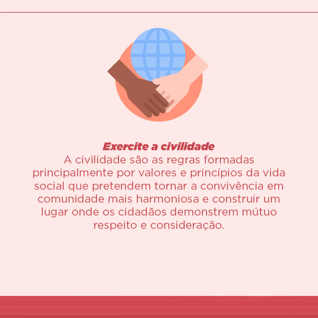 Viver em comunidade nos exige muito e não podemos fazer qualquer coisa que der vontade. Uma sociedade organizada precisa de normas para funcionar bem e, além das leis, também lidamos no dia-a-dia com as popularmente conhecidas “regras da boa convivência”. O respeito por essas regras normas de convívio dentro da sociedade é chamado de civilidade.