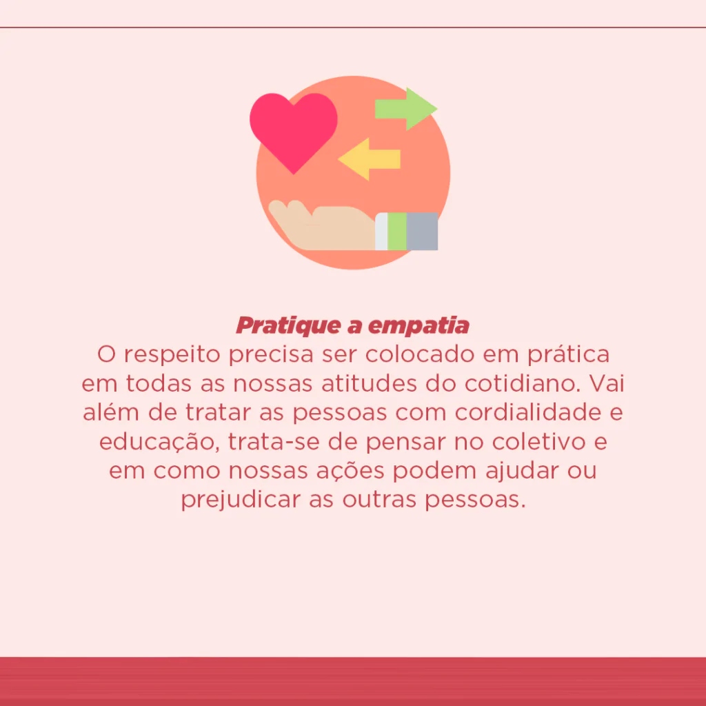 O respeito precisa ser exercitado em todas as nossas atitudes do cotidiano. Vai além de tratar as pessoas com cordialidade e educação, trata-se de pensar no coletivo e em como nossas ações podem ajudar ou prejudicar as outras pessoas.