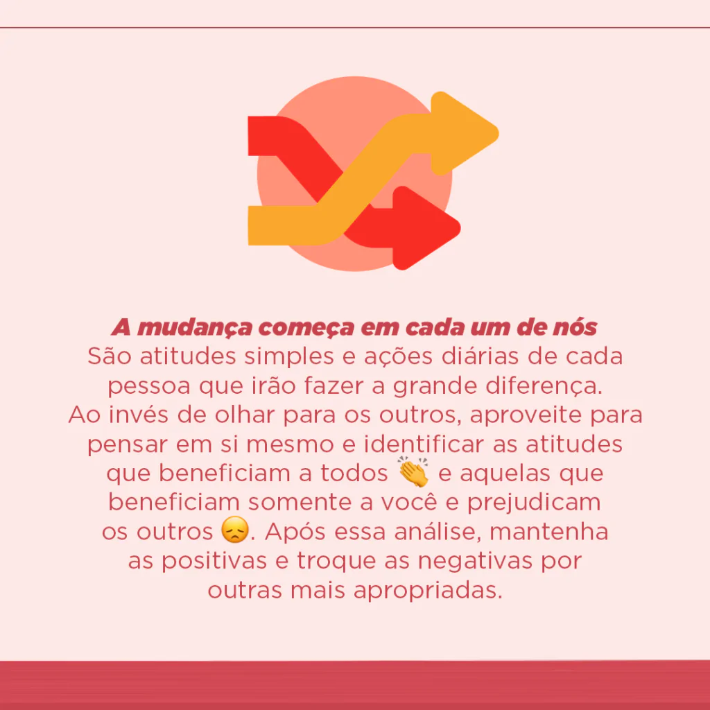 São atitudes simples e ações diárias de cada pessoa que irão fazer a grande diferença. Ao invés de olhar para os outros, aproveite para pensar em si mesmo e identificar as atitudes que beneficiam a todos e aquelas que beneficiam somente a você e prejudicam os outros. Após essa análise, mantenha as positivas e troque as negativas por outras mais apropriadas.