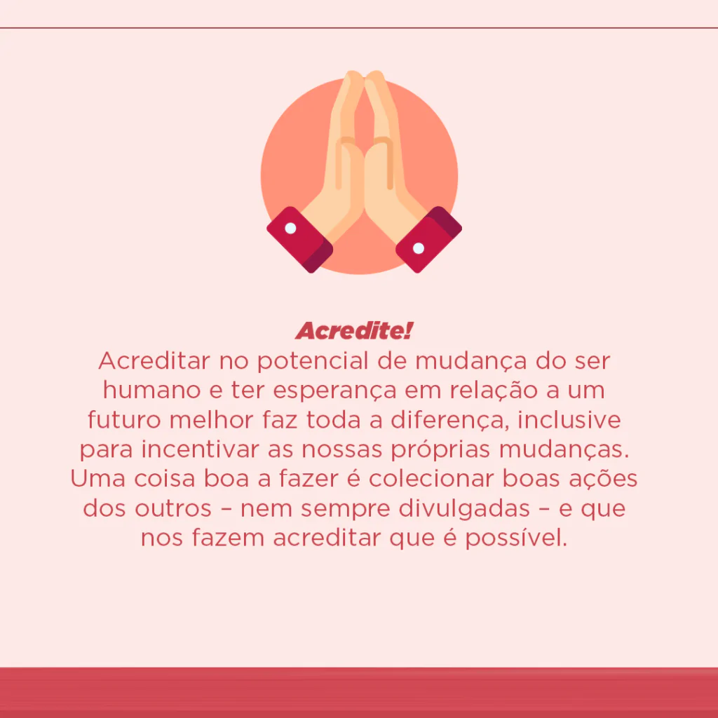 Sabemos que é uma tarefa difícil, porém não podemos desanimar e nem perder as esperanças. Acreditar no potencial de mudança do ser humano e ter esperança em relação a um futuro melhor faz toda a diferença, inclusive para incentivar as nossas próprias mudanças. Uma coisa boa a fazer é colecionar boas ações dos outros- nem sempre divulgadas- e que nos fazem acreditar ainda mais que é possível e se inspirar nelas.