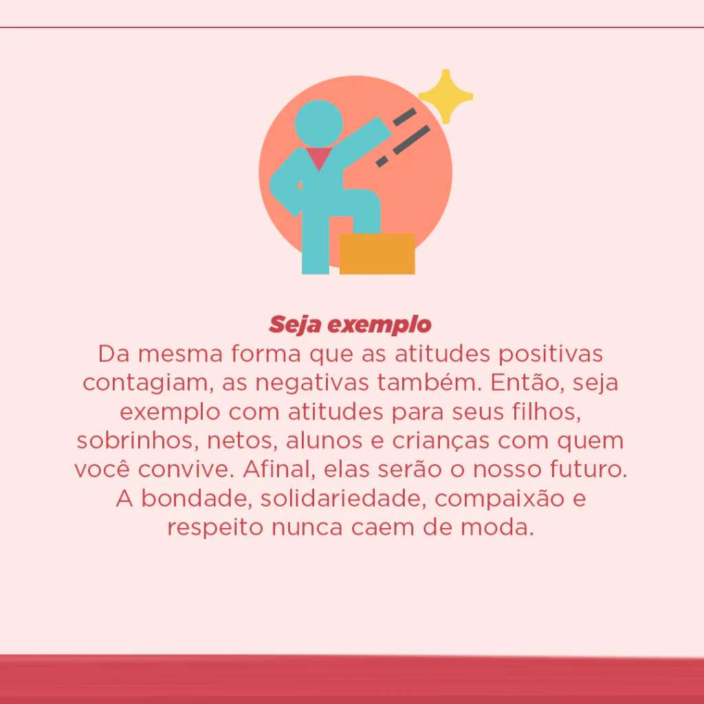 Pense que, da mesma maneira que as atitudes positivas contagiam o ambiente, as negativas também o fazem. Então, seja exemplo para seus filhos, sobrinhos, netos, alunos e crianças com quem você convive. Afinal, elas serão o nosso futuro. Lembre-se: bondade, empatia, solidariedade, compaixão, gentileza e respeito nunca caem de moda.