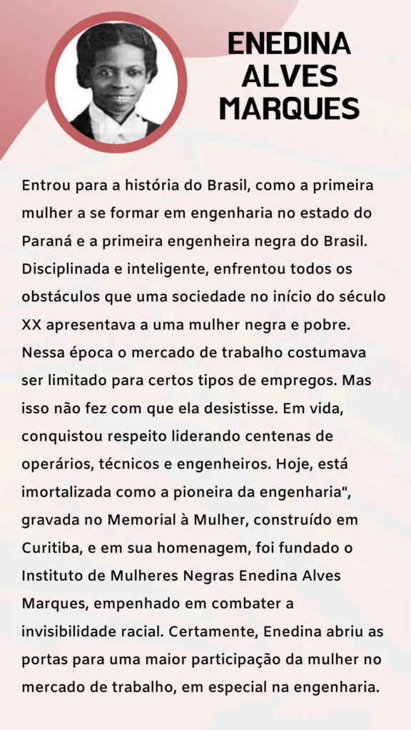 Hoje, está imortalizada como a pioneira da engenharia”, gravada no Memorial à Mulher, construído em Curitiba, e em sua homenagem, foi fundado o Instituto de Mulheres Negras Enedina Alves Marques, empenhado em combater a invisibilidade racial. Certamente, Enedina abriu as portas para uma maior participação da mulher no mercado de trabalho, em especial na engenharia