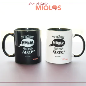 CANECAS: Você pode escolher aquela que mais tem a ver com você ou com a pessoa que deseja presentear. As opções são: a nuvem de palavras, que é super motivadora , assim como a do cérebro com a marca d’água e a do cérebro que, além de palavras motivadoras também é super criativa e única. Essa frase de Walt Disney é inspiradora “Se você pode sonhar, você pode fazer”. Então vamos sonhar sempre, acreditar que é possível e planejar para fazer acontecer!