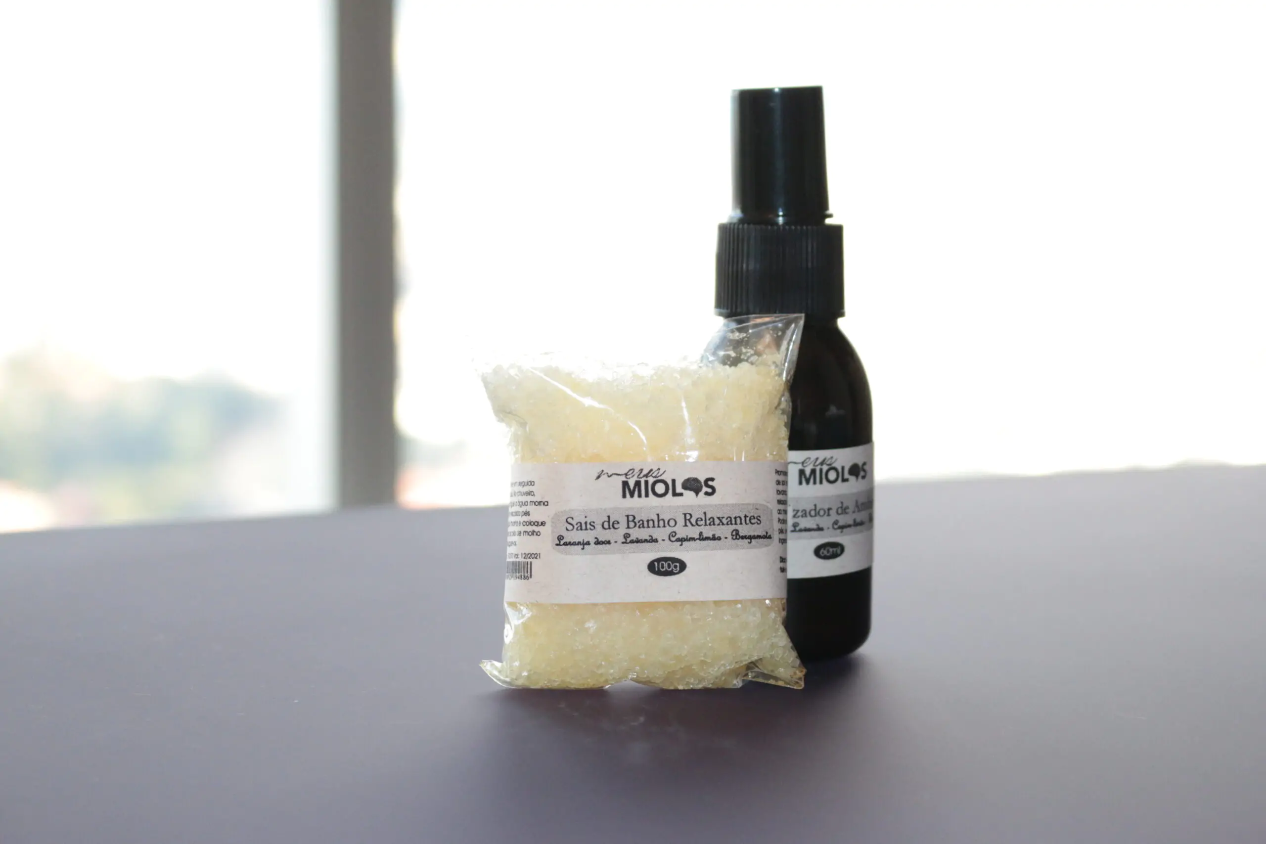 - 60 ml de aromatizador de ambientes com óleos essenciais para diminuir o stress e dormir bem (lavanda e laranja doce).